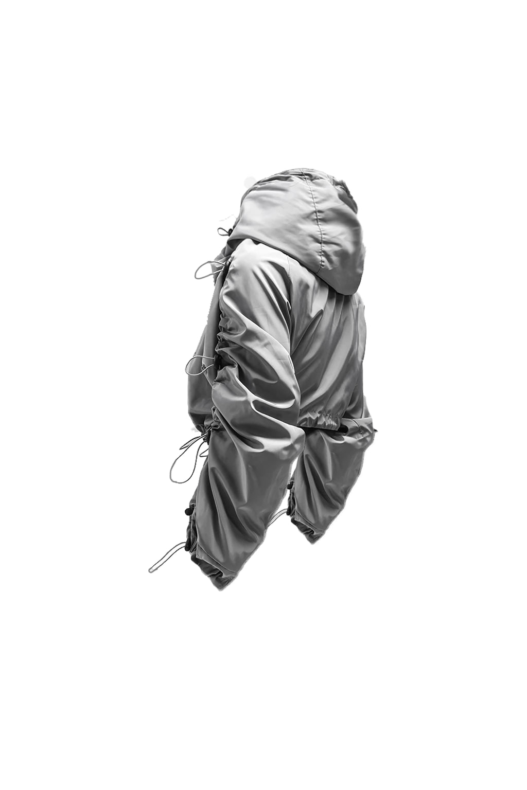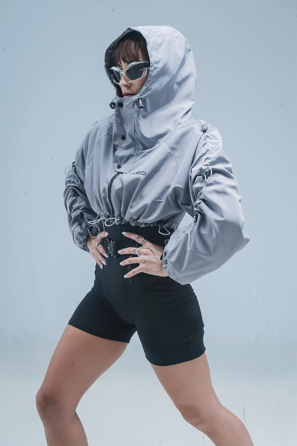The cropped cut enhances the silhouette, creating a futuristic and aggressive aesthetic. The high-protection hood, along with ruched panels and multiple tension points, give it its iconic identity.