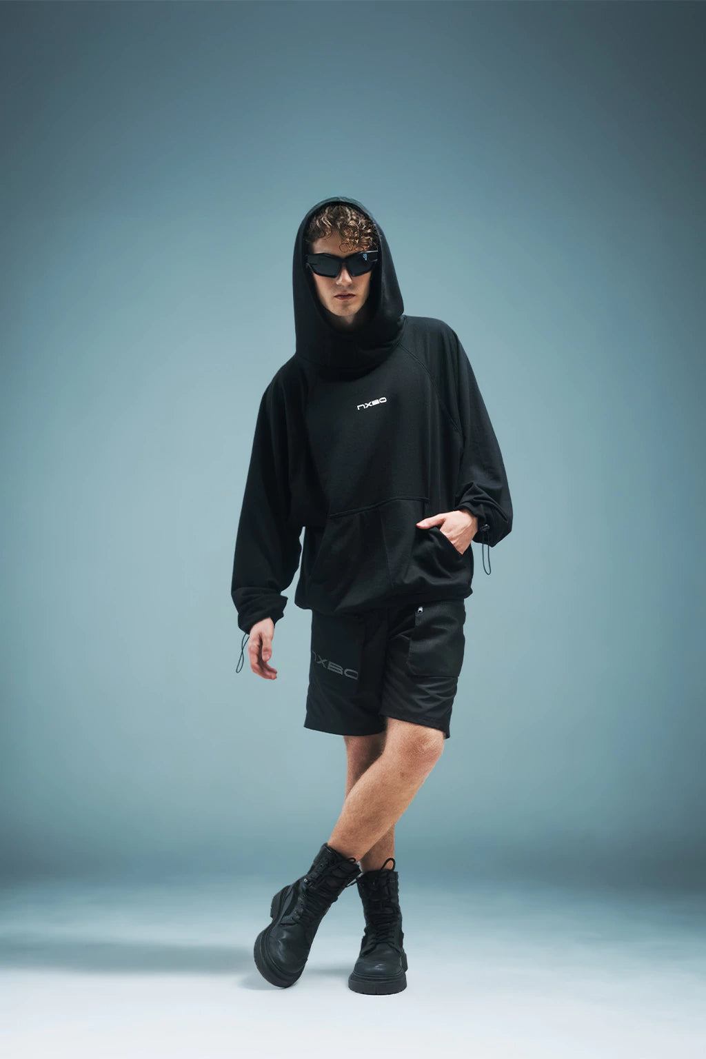 The silhouette is oversize and enveloping, featuring a wide hood and a front kangaroo pocket to carry essentials or simply rest your hands. On the front, the NXBO logo appears in a minimal format, keeping the garment clean yet recognizable within the brand's universe.