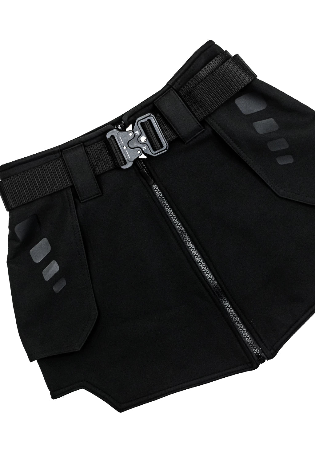 Mini falda confeccionada en tela impermeable con interior forrado en polar, lo que la hace práctica para todas las estaciones. Presenta logos de la marca e incluye un cinturón táctico de plástico (el cinturón mostrado en la imagen no está incluido; se entrega con el cinturón especial NXBO con logo blanco bordado). La modelo mide 1,60 m, pesa 60 kg y usa talle 1.