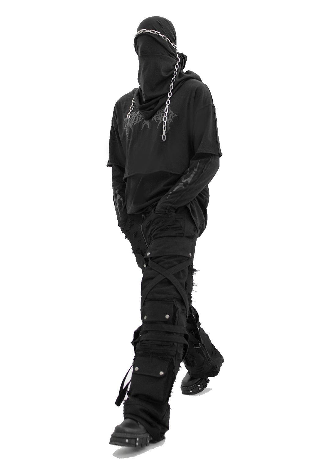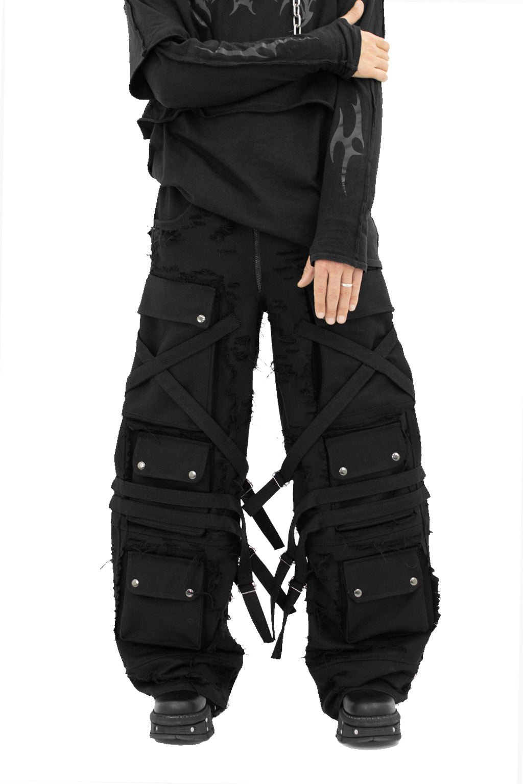 Este pantalón de corte baggy presenta desgaste artesanal y está confeccionado con doble capa de tela, logrando un efecto usado sin dejar la piel expuesta. Hecho en gabardina 100 % de algodón de 12 oz, combina durabilidad y comodidad en partes iguales. Incluye dos amplios bolsillos cargo, cuatro bolsillos medianos y bolsillos traseros tradicionales que aportan gran funcionalidad. Los cinturones decorativos y la placa metálica con el logo NX añaden un acabado urbano y distintivo. La cintura elástica garantiza un calce cómodo y adaptable.