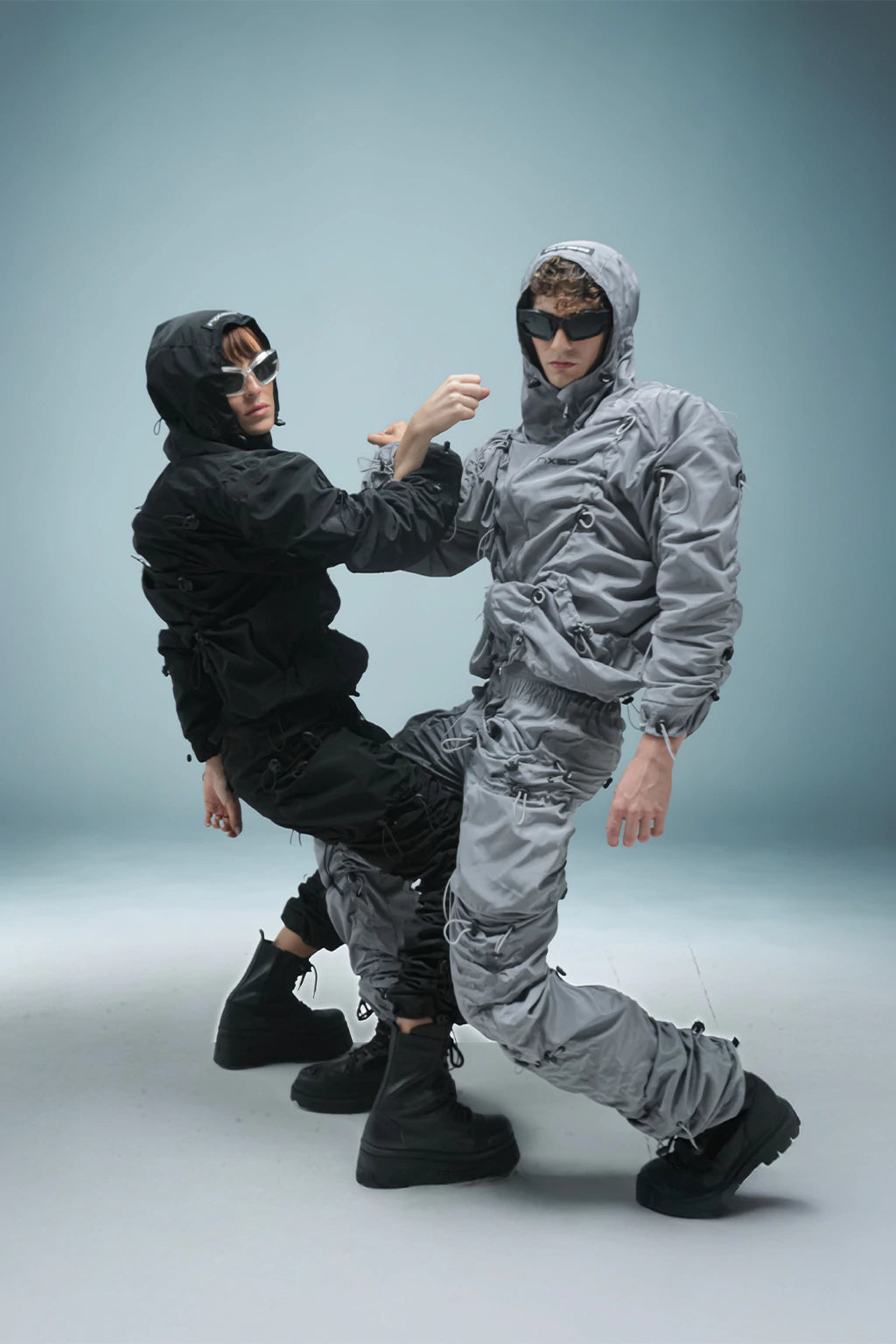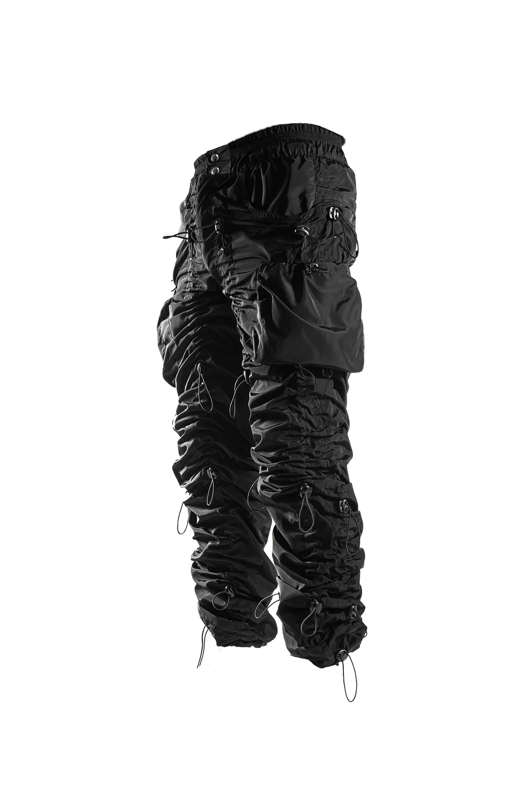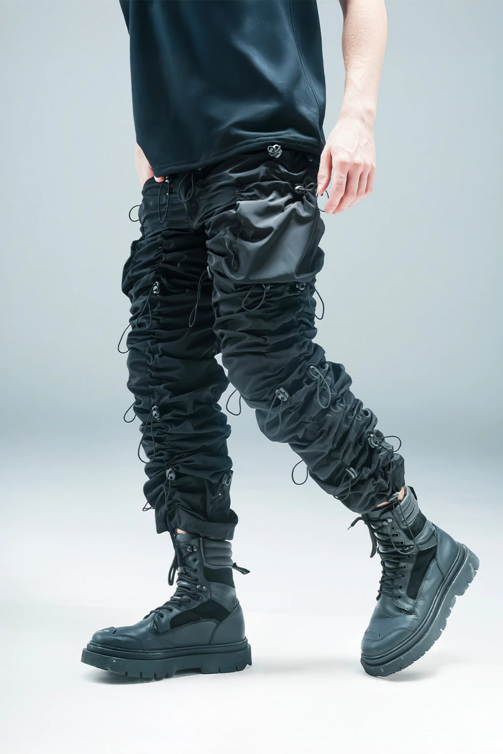 Their structure incorporates a modular adjustment system, which allows you to modify the length and width of the garment via technical cords strategically distributed along the legs. This not only improves the silhouette and fit, but also contributes a dynamic aesthetic inspired by contemporary utilitarian engineering.