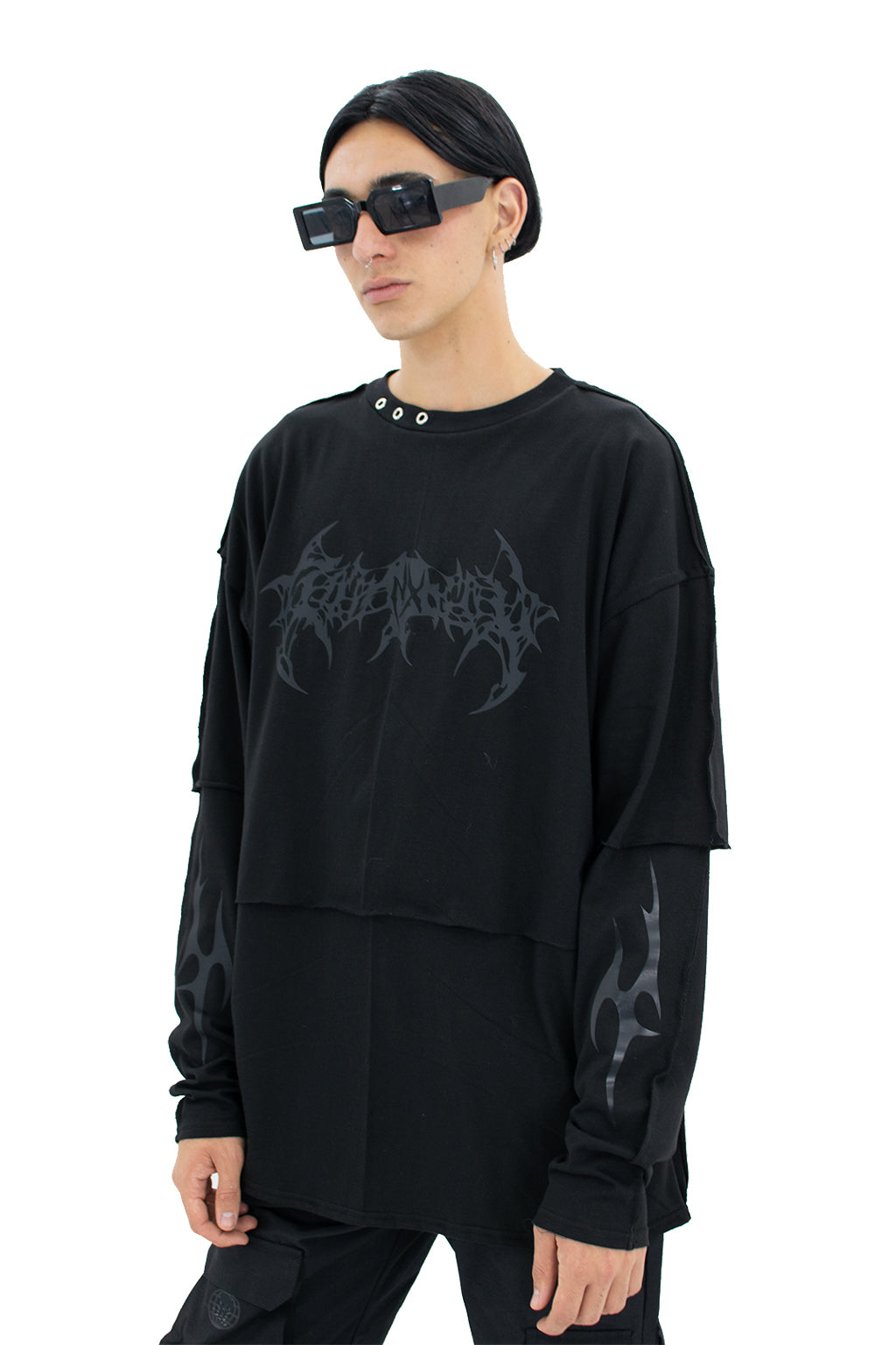 Esta remera de manga larga confeccionada en algodón 24/1 combina comodidad con estilo urbano. Presenta un efecto de triple capa simulada, el logo industrial core de NXBO y logos impresos a lo largo de las mangas, que aportan un detalle moderno y distintivo. Los ojales en el cuello acanalado y el corte oversized completan el diseño, ofreciendo un calce relajado y contemporáneo.