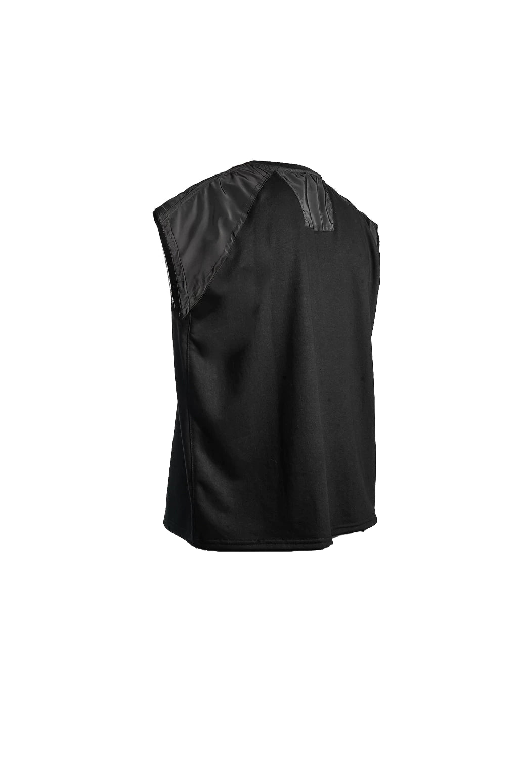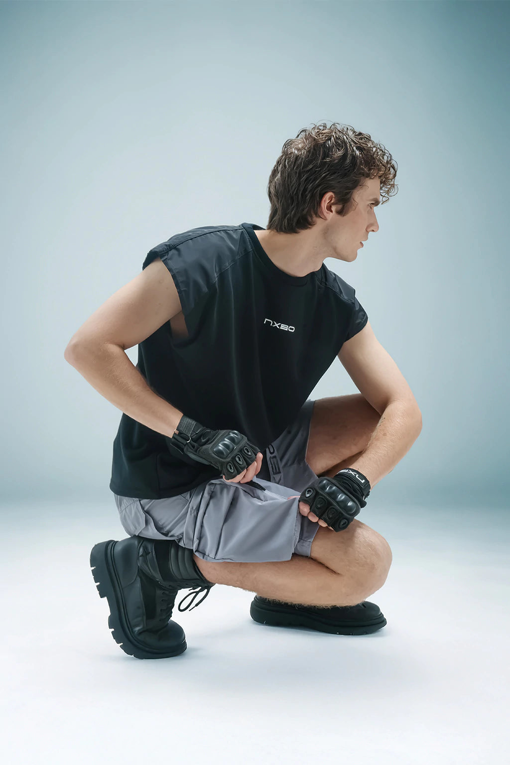 The Flex Tank is a hybrid technical boxy piece, designed for those seeking a cleaner profile without losing the strength of the NXBO universe. Constructed in high-density French terry, it incorporates reinforced technical nylon panels on the shoulders and trapezius, inspired by the light protection of tactical gear.