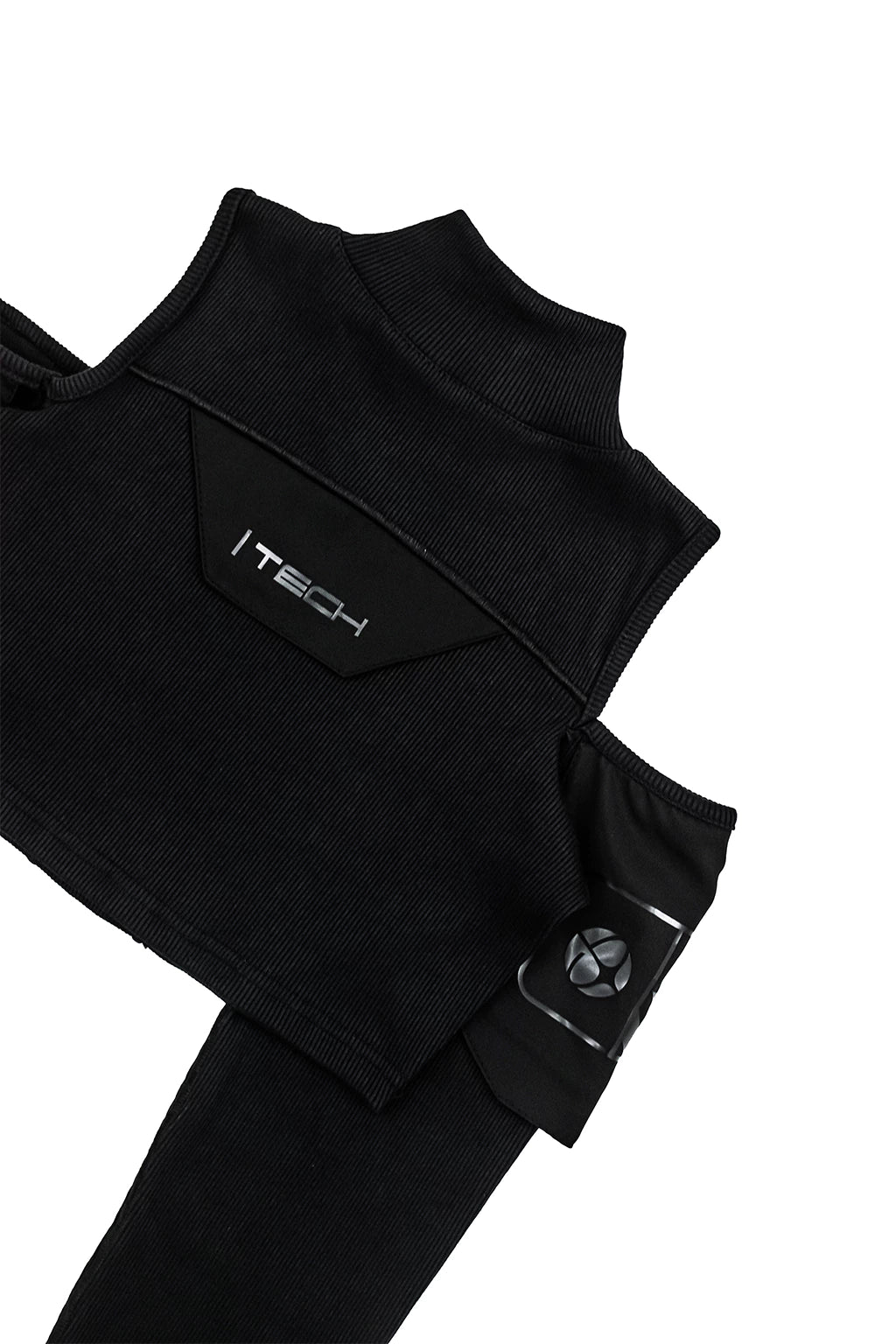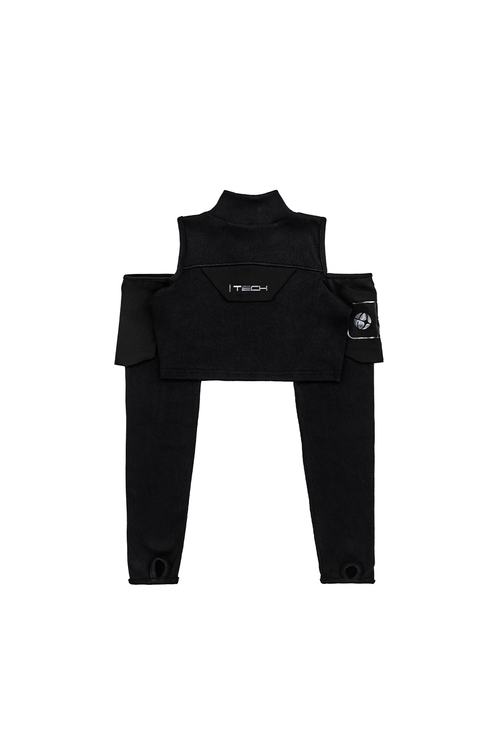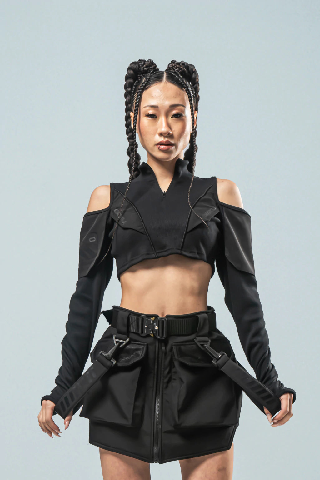 Top off-shoulder confeccionado en tela morley 100 % algodón, con cierre en el cuello y detalles en microfibra estampada. Incluye aberturas para los pulgares, brindando mayor comodidad y funcionalidad.